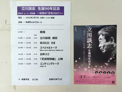 3月前半は何と言っても『立川談志生誕90周年記念 談志ザ・ムービー〜「伝説の芝浜2007」〜』というイベントに尽きるな。談志とオレは同い年だから、生きてるオレが90歳になるということは、1月生まれのあいつが生誕90周年というのは当たり前だ、ハハハ。あっちへ行ってから15年だ。